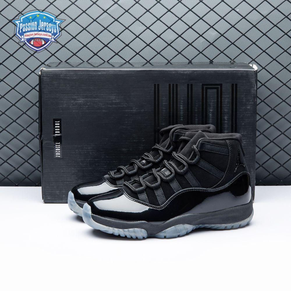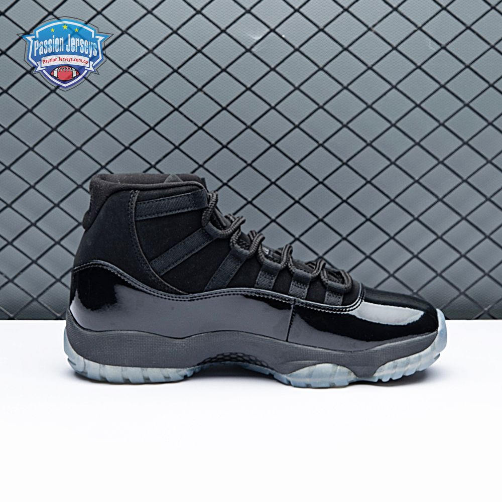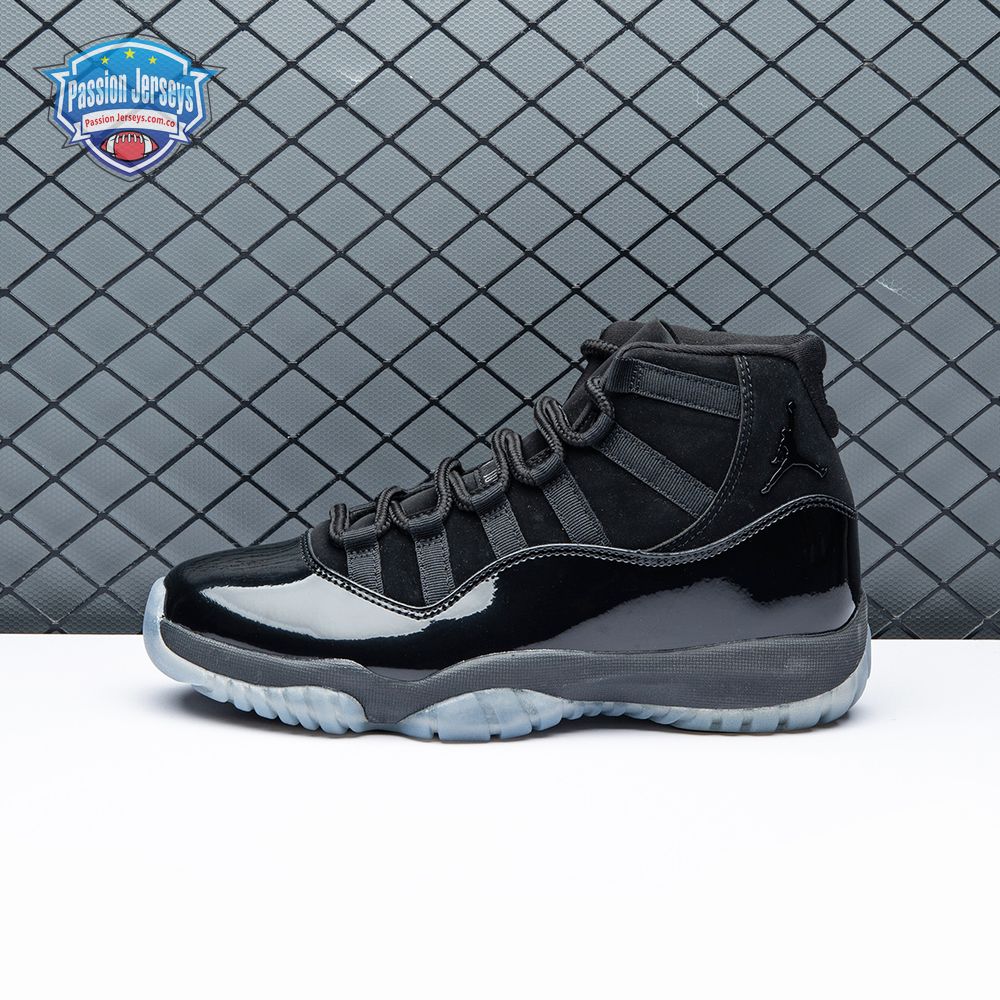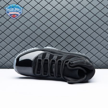 First teased in 2011 as a sample from the Air Jordan Blackout Collection, the Air Jordan 11 Retro 'Cap and Gown' was finally made available to the public in 2018. The name refers its formal look, designed to be worn for occasions such as graduation ceremonies"its laces are even inspired by graduation cords. The all-black model features a patent leather and premium nubuck upper atop an icy blue outsole.