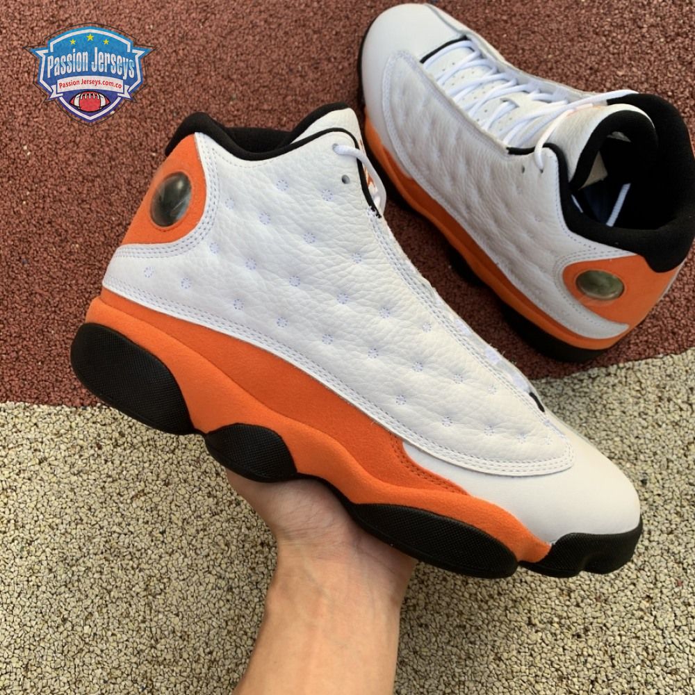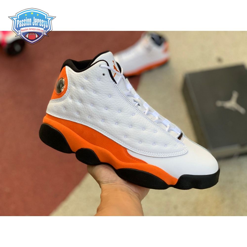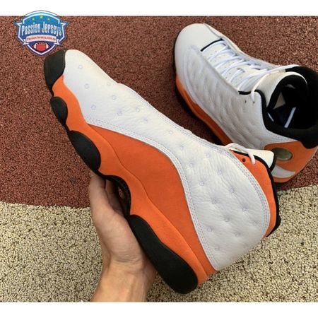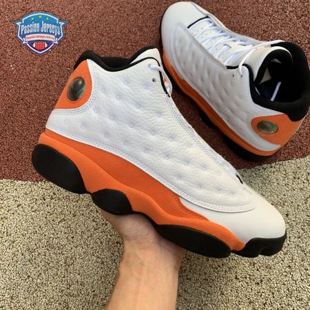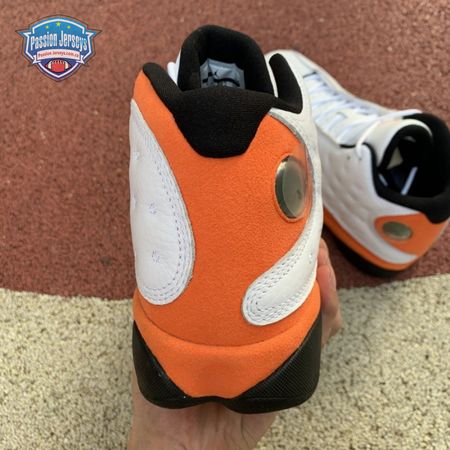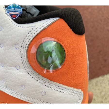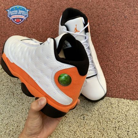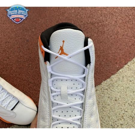 The Air Jordan 13 Retro "Starfish" features a familiar color palette that recalls the "Shattered Backboard" editions of the Air Jordan 1. The upper combines a white tumbled leather base with orange suede paneling and signature dimpled overlays in more white leather. Traditional branding elements include an embroidered Jumpman atop the tongue and the 13's holographic eye on the lateral ankle. A contrasting black finish is applied to the panther-paw outsole.