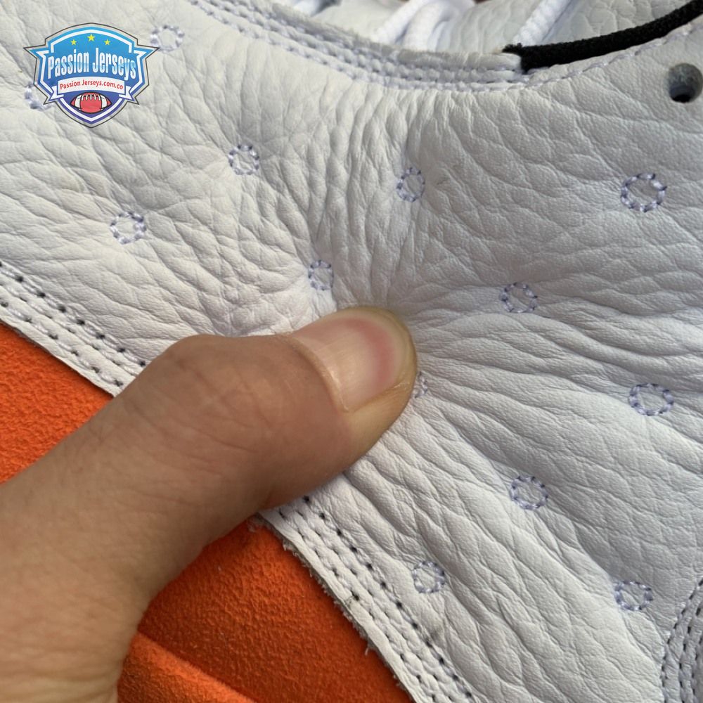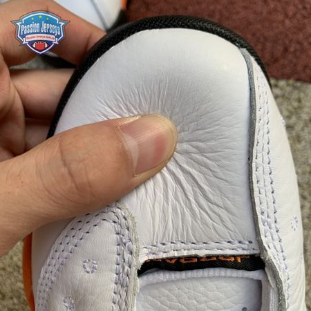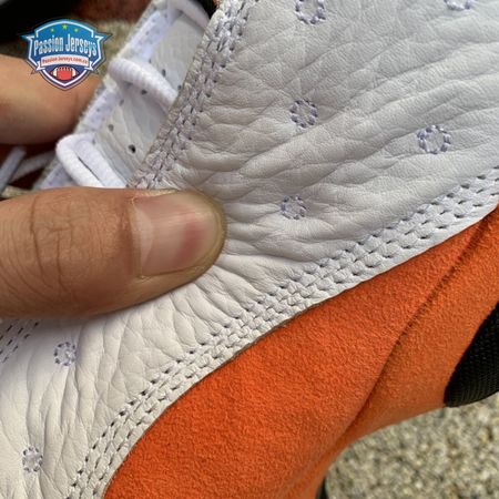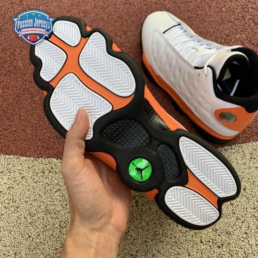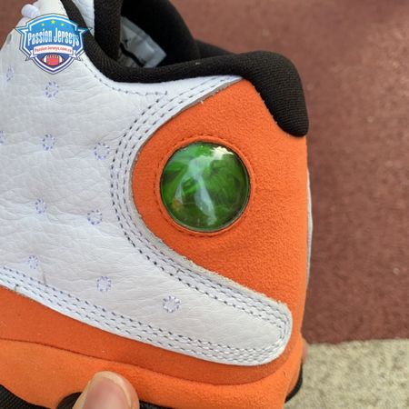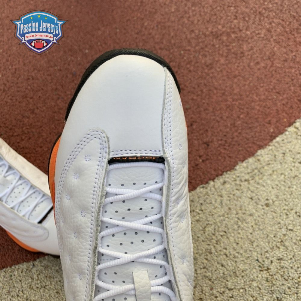 The Air Jordan 13 Retro "Starfish" features a familiar color palette that recalls the "Shattered Backboard" editions of the Air Jordan 1. The upper combines a white tumbled leather base with orange suede paneling and signature dimpled overlays in more white leather. Traditional branding elements include an embroidered Jumpman atop the tongue and the 13's holographic eye on the lateral ankle. A contrasting black finish is applied to the panther-paw outsole.