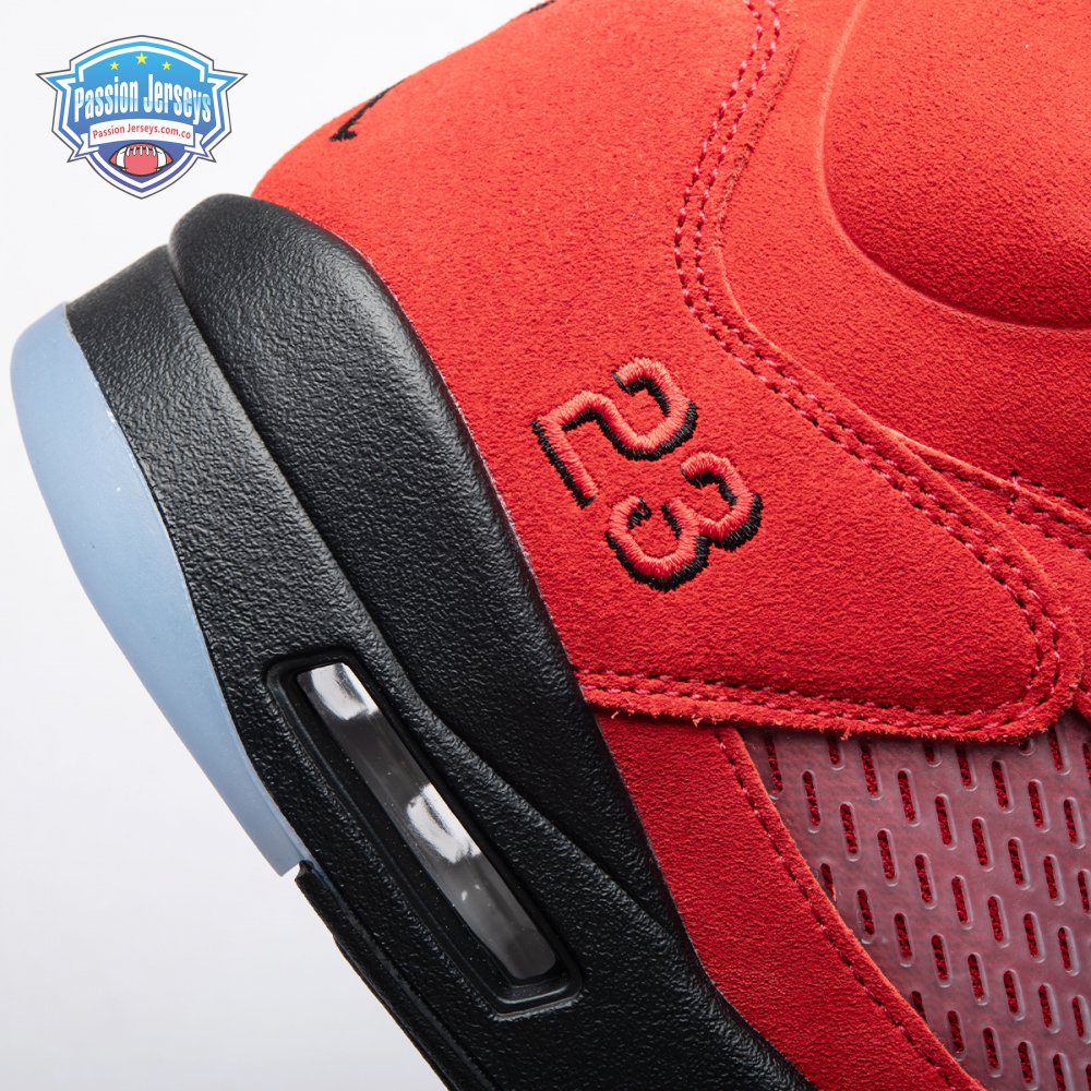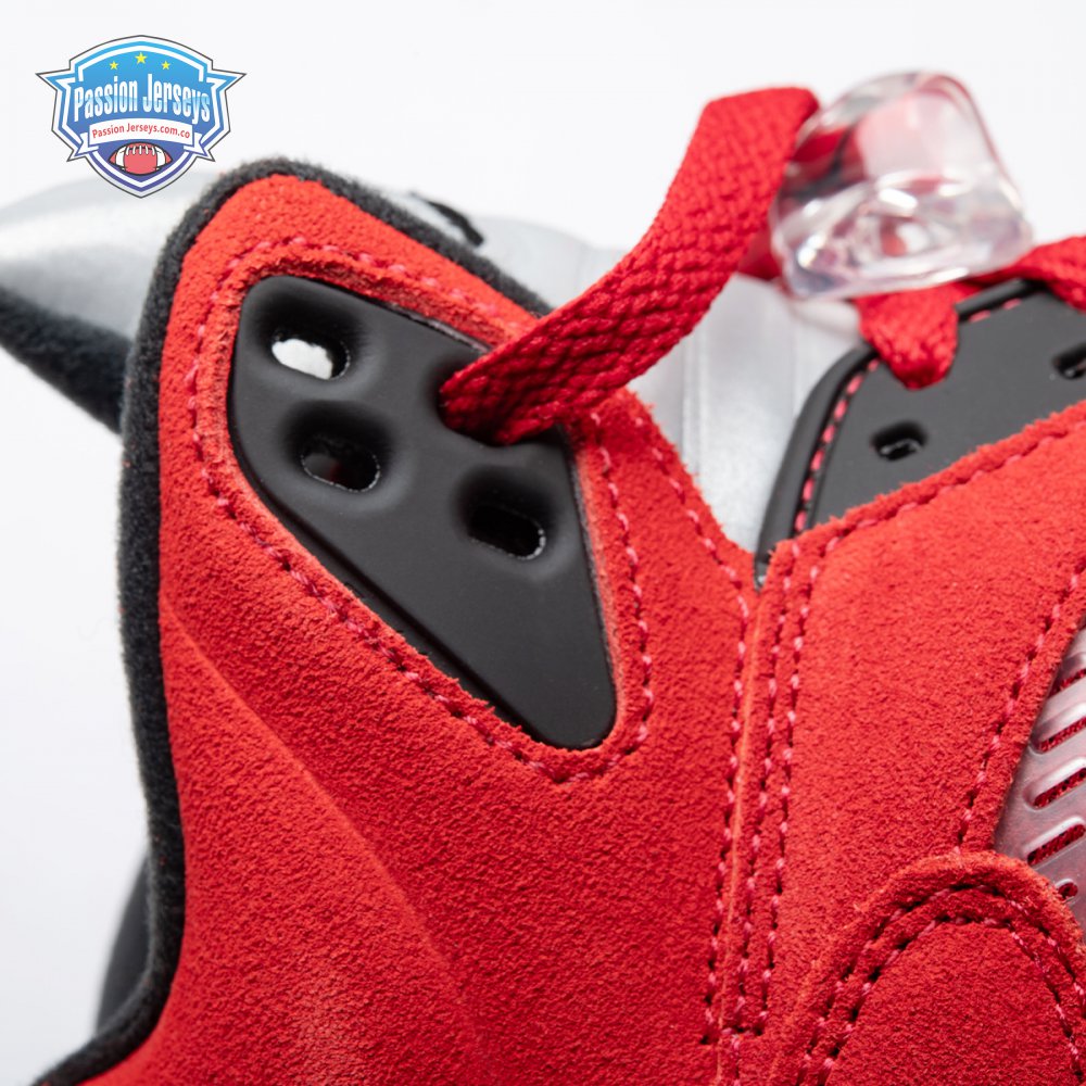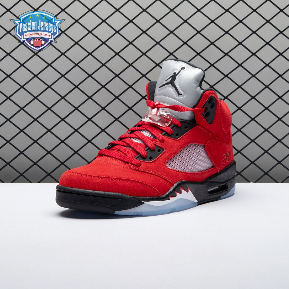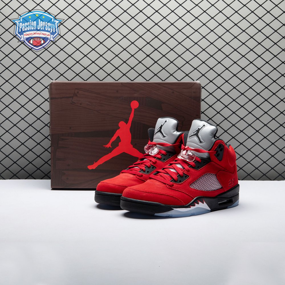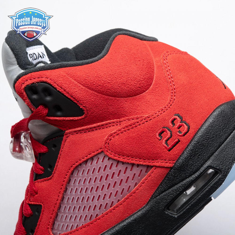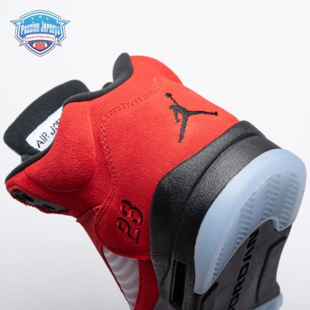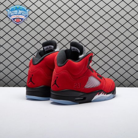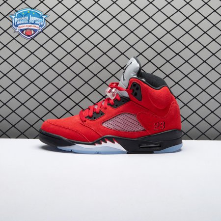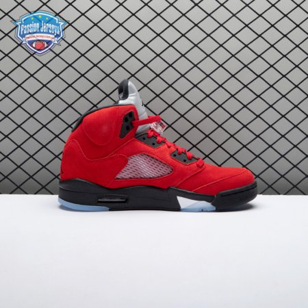 The 2021 reissue of the Air Jordan 5 Retro "Raging Bull" brings back a beloved colorway originally released as one-half of 2009"s Air Jordan 5 Raging Bulls Pack. The shoe"s defining feature is a plush Varsity Red suede upper, equipped with black eyelets and a Jumpman-branded reflective silver tongue. The heel overlay displays a second Jumpman logo and an embroidered 23 on the lateral side. A visible Nike Air heel unit enhances the polyurethane midsole, accented with red-tipped shark tooth detailing and supported by an icy translucent outsole.