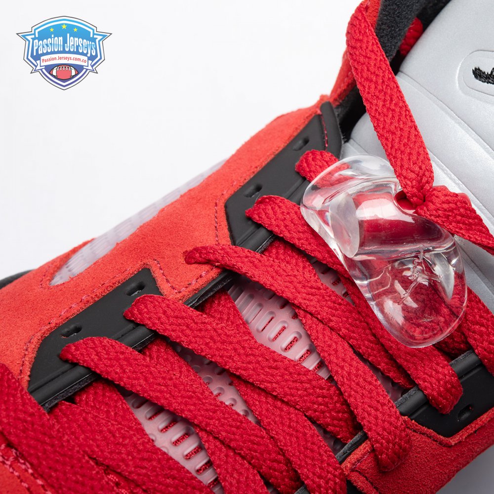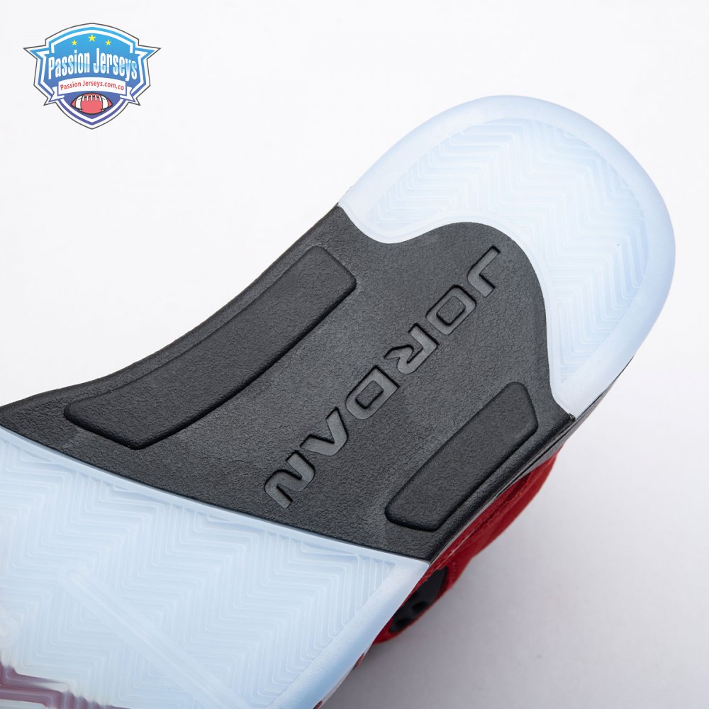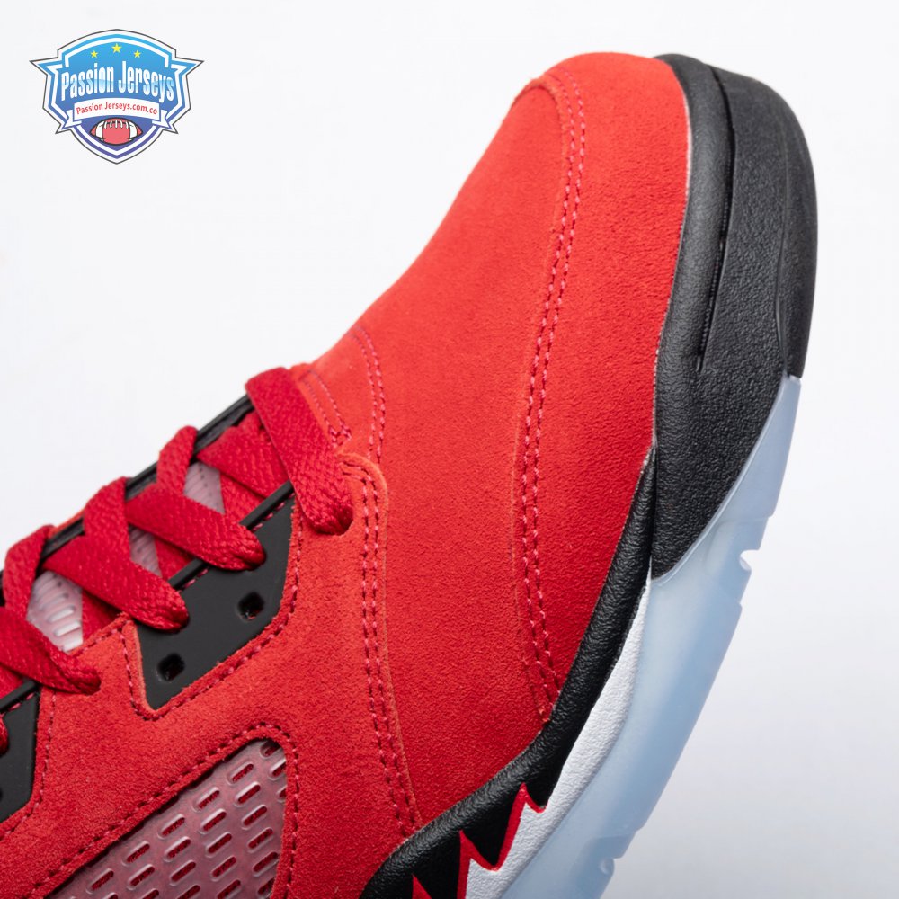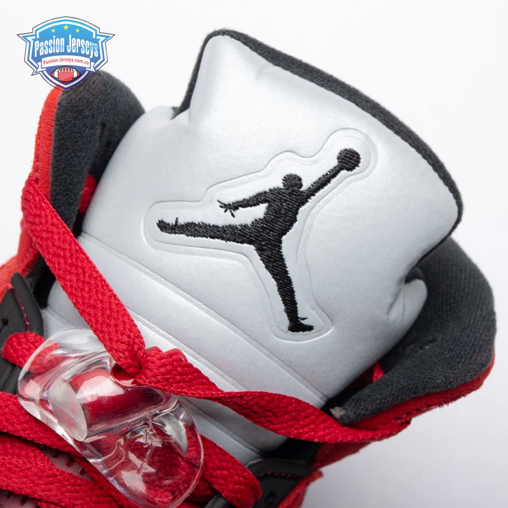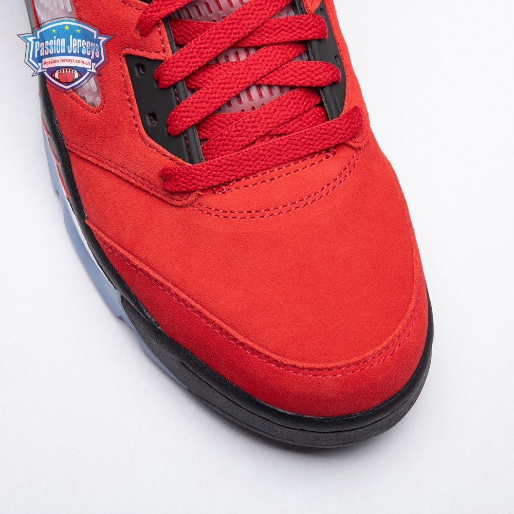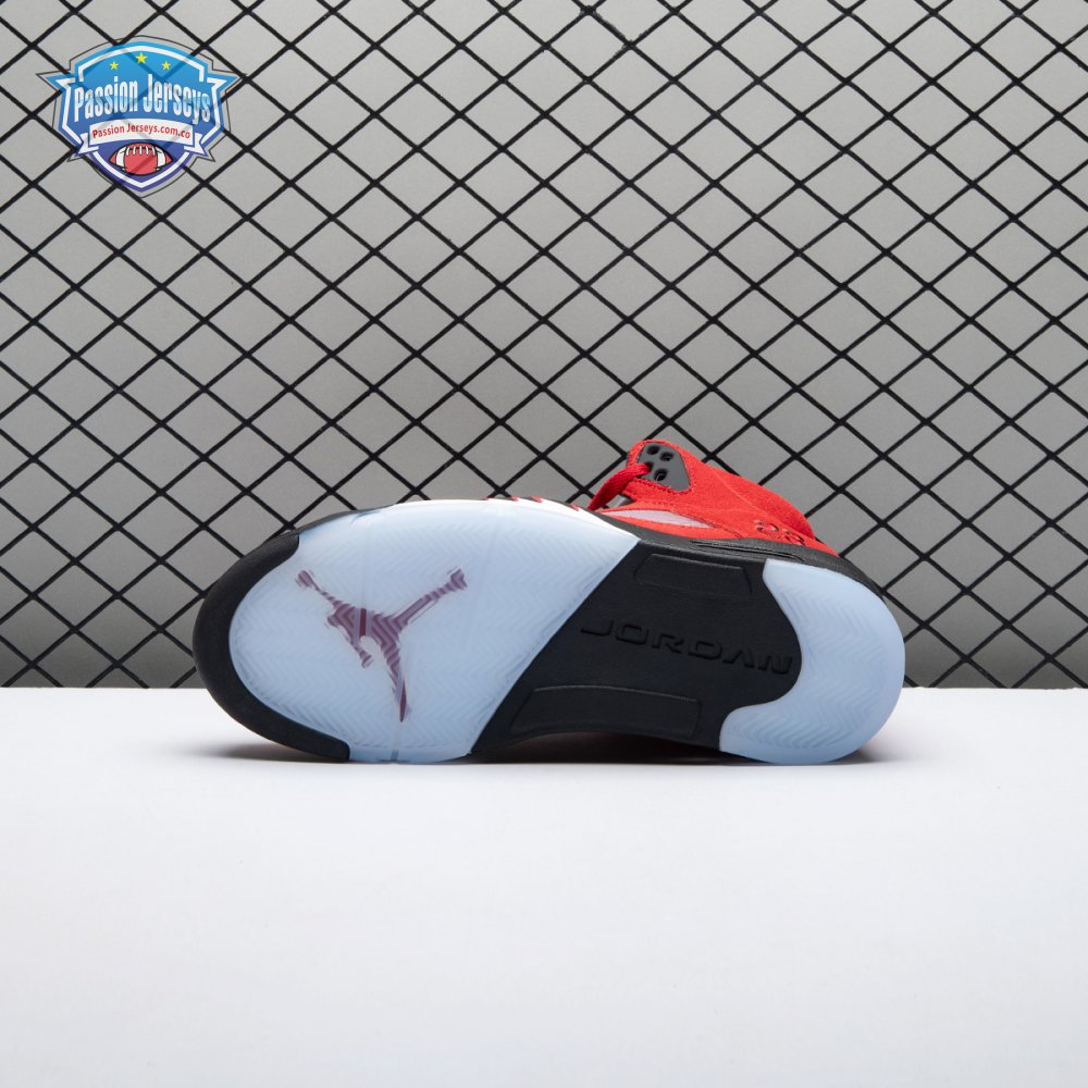The 2021 reissue of the Air Jordan 5 Retro "Raging Bull" brings back a beloved colorway originally released as one-half of 2009"s Air Jordan 5 Raging Bulls Pack. The shoe"s defining feature is a plush Varsity Red suede upper, equipped with black eyelets and a Jumpman-branded reflective silver tongue. The heel overlay displays a second Jumpman logo and an embroidered 23 on the lateral side. A visible Nike Air heel unit enhances the polyurethane midsole, accented with red-tipped shark tooth detailing and supported by an icy translucent outsole.