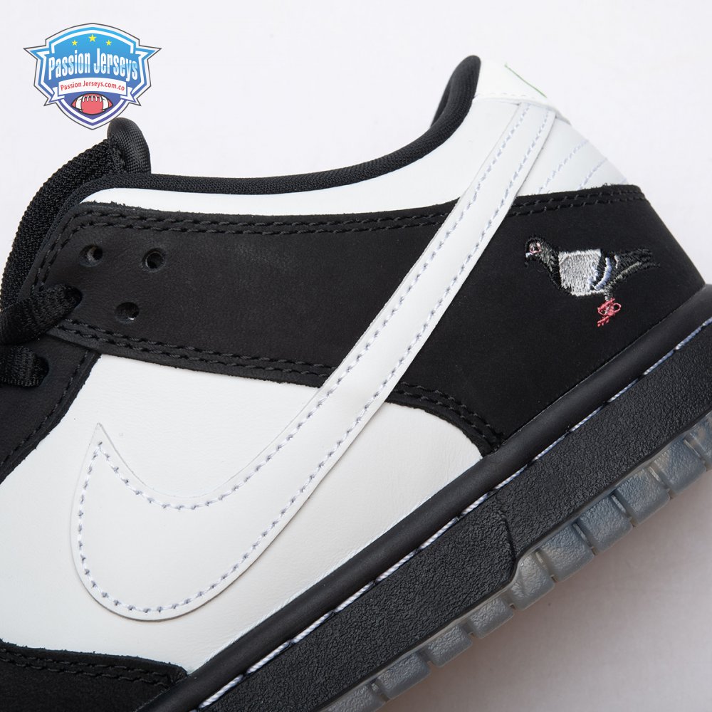 Originally conceived as a sample colorway that was initially rejected, the Jeff Staple x Dunk Low Pro SB "Panda Pigeon" continues Staple"s long-running partnership with Nike SB. The design lives up to its name with a black and white color scheme on the leather and suede upper, complete with the all-important pigeon on the lateral heel. A translucent outsole reveals a collage made up of newspaper headlines alluding to the infamous Pigeon Dunk launch from 2005.